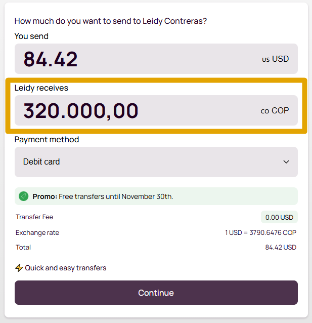 Once you've decided which plan or package best suits your needs, click the button below and enter the price in COP (Colombian Pesos) in the form, as shown in the reference image. Then fill in your information under 'Payment Method' and click 'Continue'.
